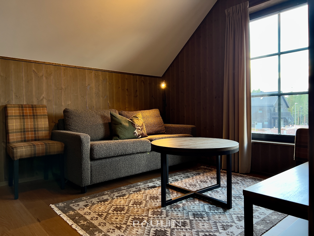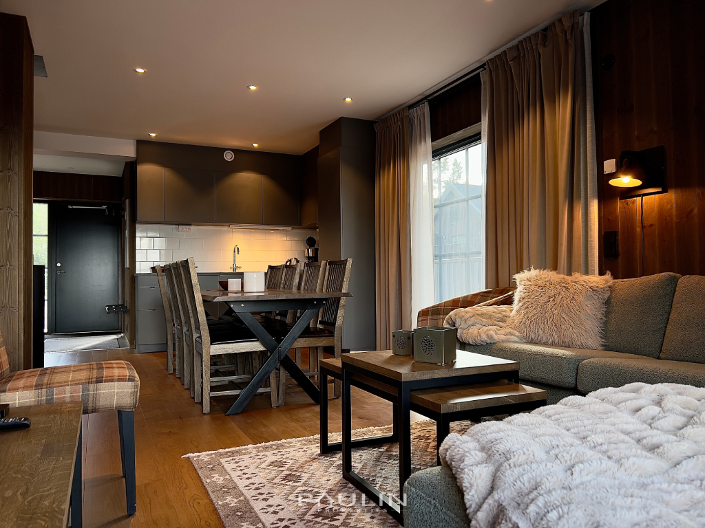 This light-filled, two-story apartment is located on the second floor and boasts windows in every direction for a bright and airy atmosphere. It includes three bedrooms (two king beds and one bunk bed), a spacious kitchen and dining area, and two inviting social rooms, making it an excellent choice for larger families or groups. A glass bedroom wall adds a modern touch, while a private balcony provides views of the pool and padel court (available during warmer months). Additional comforts include a bathroom with a sauna, shower, washing machine, a separate WC, and a drying cabinet in the entrance.